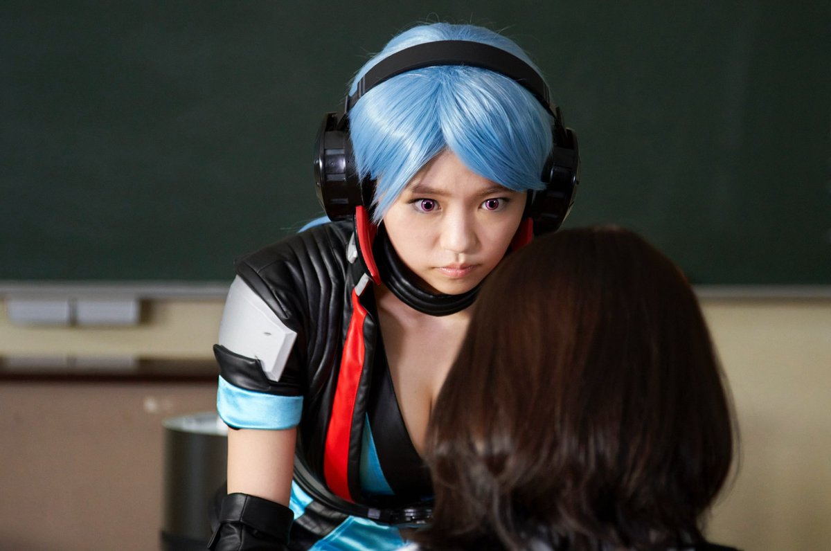 アリス役の大原は、青いウィッグをかぶり、近未来的なデザインのボディスーツを身にまとっている。
