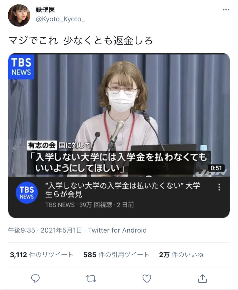 大学「コロナでやばい?ふむ…ならオンラインにしてみてはどうだろうか」 2021年04月22日 カテゴリ:なんJ 1: アゲイン速 21/04/21(水)14:40:33 ID:kXEg 大学「だが施設費は頂いておくぞ」 【大学「コロナでやばい?ふむ…ならオンラインにしてみてはどうだろうか」】の続きを読む タグ :#大学