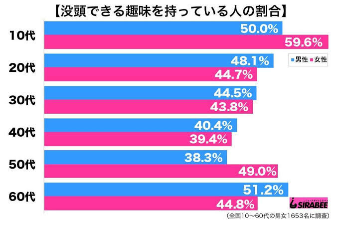 【悲報】最近の若者、5割以上が趣味なし 2021年06月07日 カテゴリ:社会・生活 1: 僕は名無し 2021/06/04(金) 01:22:03.09 ID:4cG4ZJHU0 没頭できる趣味を持ってる人の割合 20代男性 48.1% 20代女性 44.7% 30代男性 44.5% 30代女性 43.8% 【【悲報】最近の若者、5割以上が趣味なし】の続きを読む タグ :#若者
